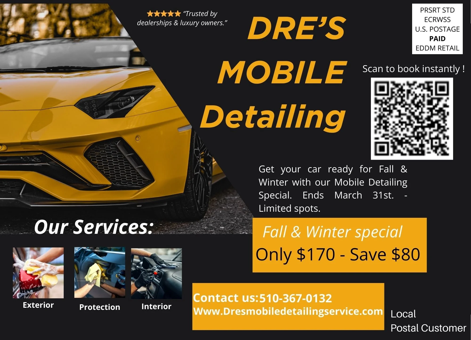 Tired of driving around in a dirty car? Dre's mobile detailing service is here to help. We bring the car wash to your location, providing a convenient and professional cleaning experience. Our team of detailers will arrive with all the necessary equipment and supplies to give your car a thorough cleaning, both inside and out. From washing and waxing the exterior, to vacuuming and cleaning the interior, we'll leave your car looking and smelling fresh. Take the hassle out of car cleaning and let us come to you. Book our mobile detailing service today and enjoy a pristine ride.